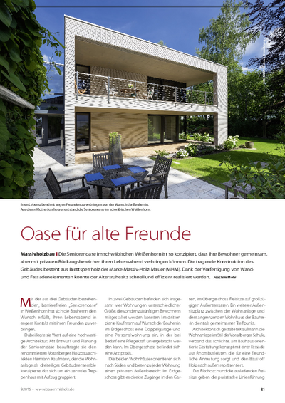 The senior citizens' oasis in the Swabian town of Weißenhorn is designed in such a way that its residents can spend their retirement together, but with private retreat areas. The load-bearing structure of the building is made of cross-laminated timber of the Massiv-Holz-Mauer (MHM) brand. Thanks to the prefabrication of wall and façade elements, the retirement home could be realized quickly and efficiently.