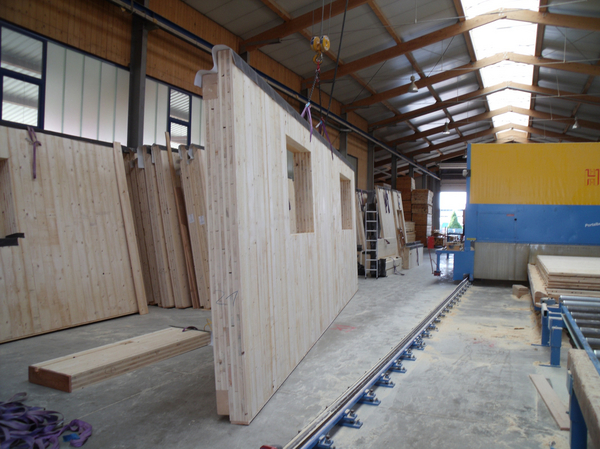 Après la planification de l'exécution qui contient toutes les informations de planification, suit une planification de la construction en bois ou de la fabrication qui s'appuie sur cette planification ; c’est généralement le producteur MHM qui s’en charge. Les éléments extérieurs et intérieurs avec les superstructures, p. ex. le matériau isolant, sont définis à ce stade. En outre, l’ensemble du bâtiment est réparti en éléments muraux individuels et transportables (« conçu en éléments »). Les ouvertures des fenêtres sont également planifiées et pour le futur équipement technique du bâtiment et les raccords des éléments de construction, les ouvertures, fraisages et perçages correspondants sont prévus sur les murs et élaborés avec précision par un centre d'usinage à portique CNC. Le délai de production de tous les éléments muraux MHM n’est que de trois à quatre jours environ pour une maison individuelle moyenne d’une surface habitable de 120 à 150 m².