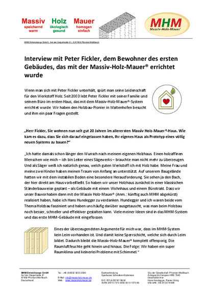Die Entscheidung, das Massiv-Holz-Mauer-System für sein Eigenheim zu nutzen, fiel nach Gesprächen mit Hans Hundegger, einem der Entwickler des Systems. Der entscheidende Vorteil von MHM gegenüber anderen Holzbau-Systemen war für Fickler der komplette Leimverzicht: Das ermöglicht nicht nur die Verbesserung des Dämmwerts und der thermischen Trägheit, sondern auch ein sehr natürliches und Raumklima.